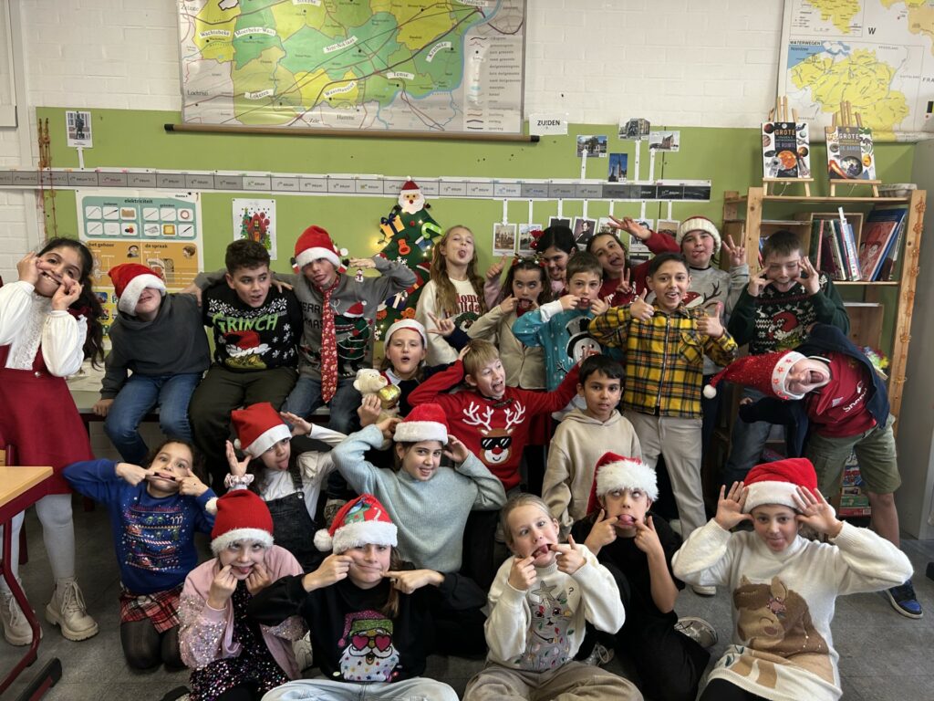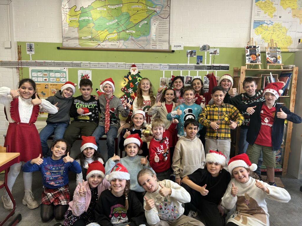 De laatste week van 2025 in het vierde leerjaar zit er op! De week stond helemaal in teken van kerst. Zo hebben we het gemiddelde leren berekenen in kerstthema, zongen we kerstliedjes (zélfs in het Spaans), vouwden we kerststerren, hebben we kerstraadsel opgelost, … Natuurlijk konden we vandaag niet anders dan deze kerstweek afsluiten met onze beste kerstkledij of accessoires.